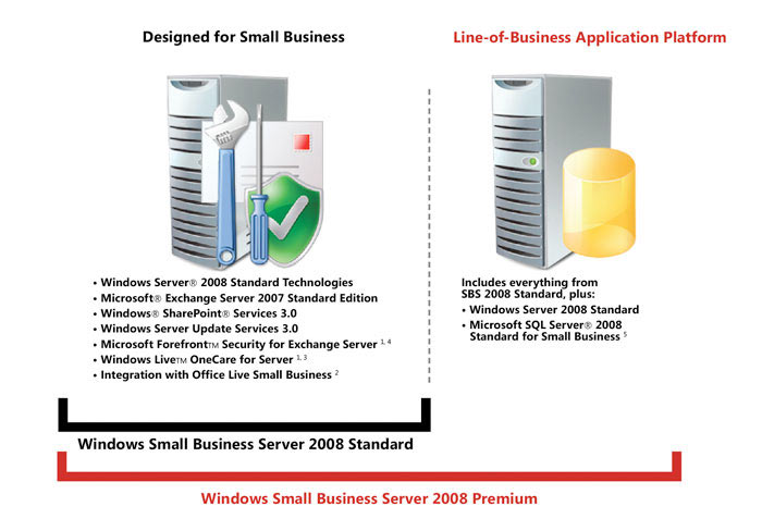Windows Small Business Server 2008 Premium Edition becomes a second server solution. Windows Small Business Server 2008 Standard Edition will run on one hardware server, and Windows Small Business Server 2008 Premium Edition will run on two hardware servers, with the second server running Windows Server and SQL Server for line-of-business applications.